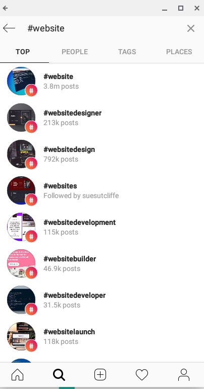 To interact with a hashtag, users can either click a hashtag which has been used in a post they are viewing, or they can search it in the search bar which will also provide a drop-down menu of other popular tags. This allows for what I call a “rabbit hole” effect, where a user can start at one hashtagged topic and end up somewhere completely different. This allows you to use a wide range of tags, the key being that you make sure you are using the most relevant of each.