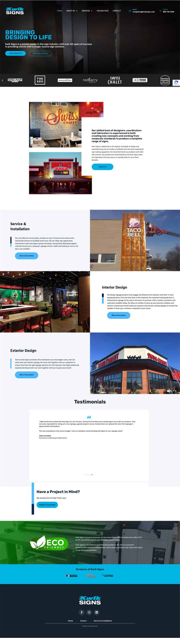 Project Overview Kwik Signs, a leader in the Canadian signage industry for over 40 years, required a digital presence that matched their manufacturing capabilities. The goal was to shift the brand perception from a local “print shop” to a national infrastructure partner capable of executing massive rollouts for franchises and developers. The new website focuses on validating their capacity—showcasing everything from 50-foot pylon signs to complex vehicle fleet wraps—while streamlining the technical intake process for their B2B clients.